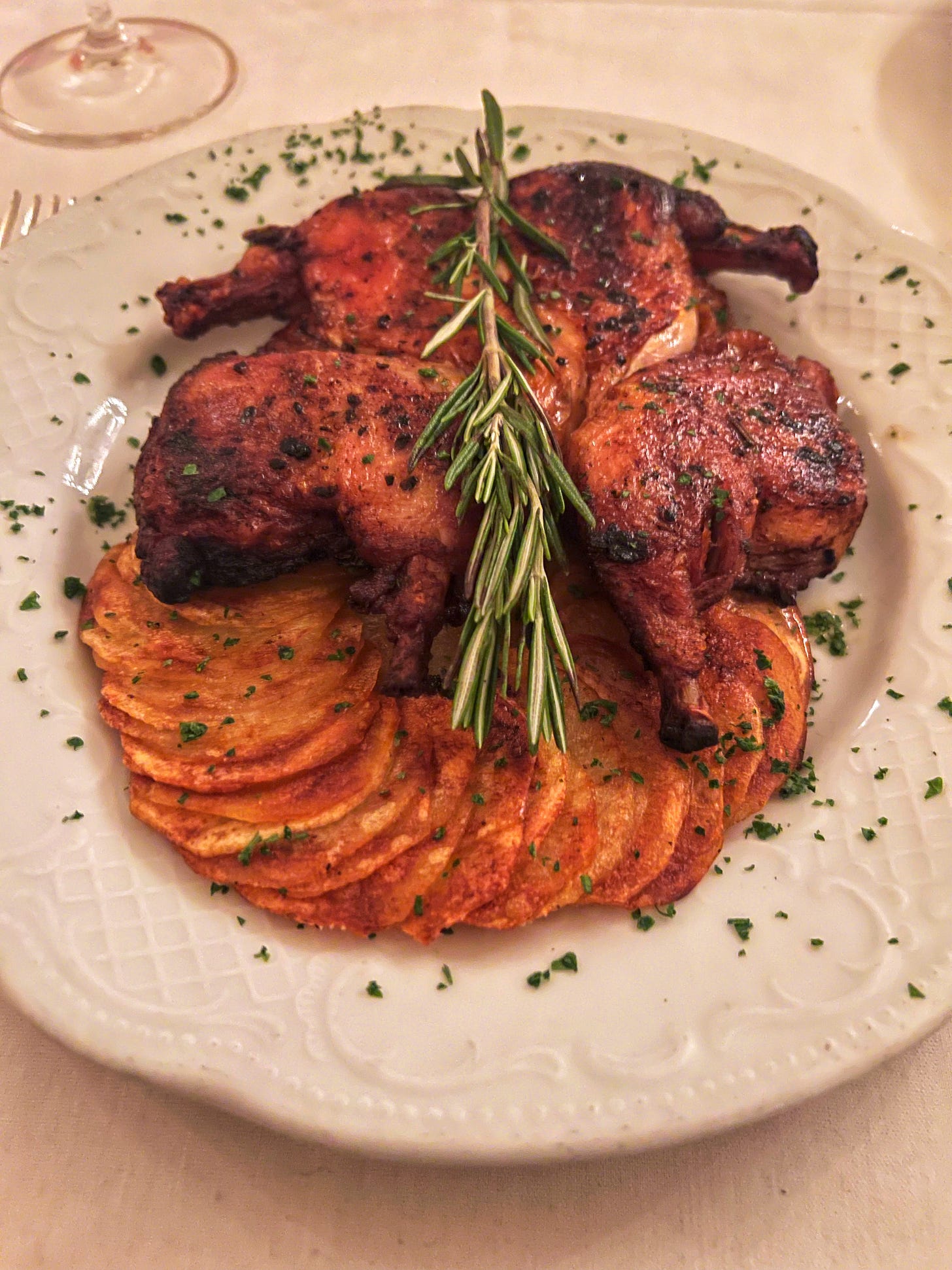 We had another dinner on that trip at one of New York’s newer restaurants, a place regularly rated as one of the best in the city. Maybe I’m being sentimental, but the meal at Barbetta was better, and not just because the atmosphere and service was pricelessly gracious. Everything was delicious and perfectly prepared: the poached Girello of Veal; the house-made Agnolotti, a dish first introduced in 1906; the Risotto alla Piemontese with wild porcini mushrooms (1906); the Roasted Rabbit alla Piemontese, served with Savoy cabbage (1995); and Pollo al Babj (1962).