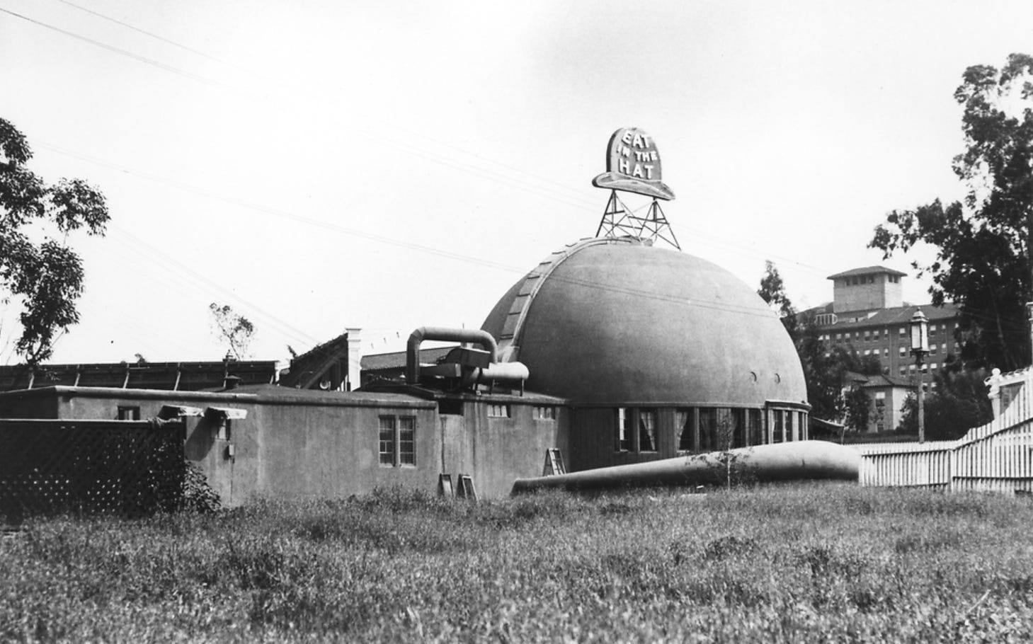 The Brown Derby opened on Wilshire Boulevard, across from the Ambassador Hotel, in 1926. The restaurant’s defining characteristic was, is and always shall be that the building was in the shape of a large, brown derby. Atop the crown was a neon sign that flashed the message “Eat at the Hat.”